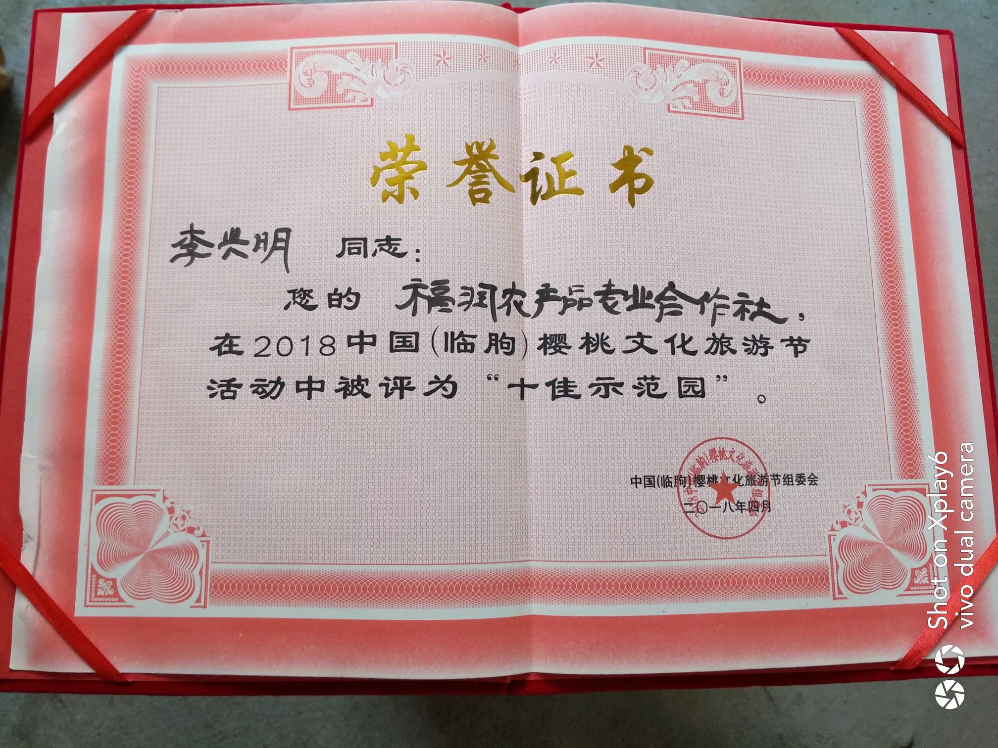 福润农产品专业合作社在2018中国樱桃文化旅游节活动中评为十佳示范园