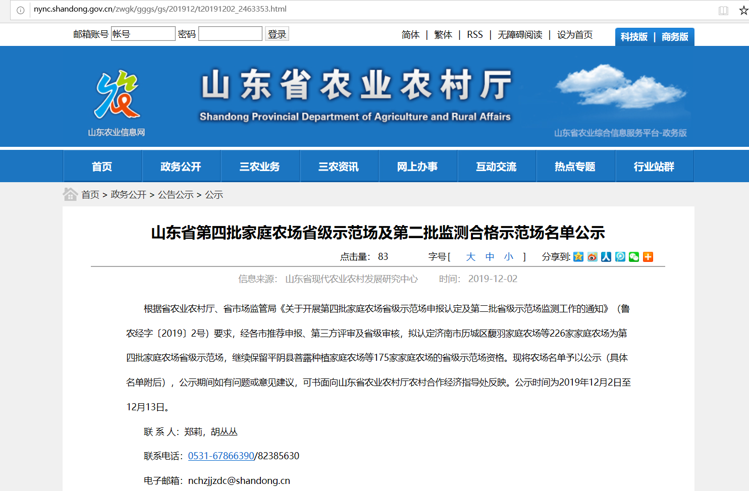 根据省农业农村厅、省市场监管局《关于开展第四批家庭农场省级示范场申报认定及第二批省级示范场监测工作的通知》(鲁农经字〔2019〕2号)要求,经各市推荐申报、第三方评审及省级审核,拟认定济南市历城区馥羽家庭农场等226家家庭农场为第四批家庭农场省级示范场,继续保留平阴县菩露种植家庭农场等175家家庭农场的省级示范场资格。现将农场名单予以公示(具体名单附后),公示期间如有问题或意见建议,可书面向山东省农业农村厅农村合作经济指导处反映。
